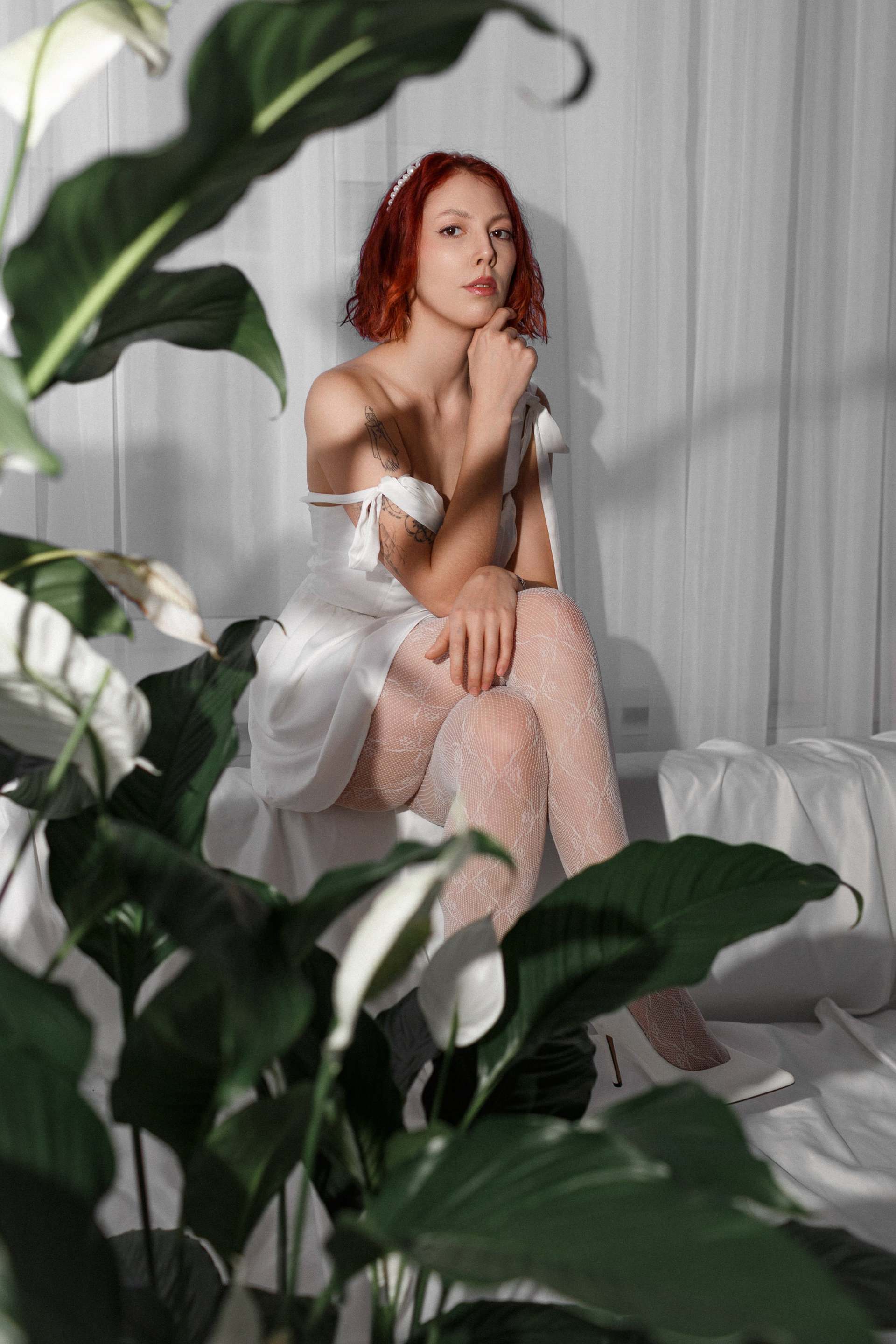 Светлая интерьерная локация, много естественного света, лёгкими прозрачные ткани, нежные цветы.